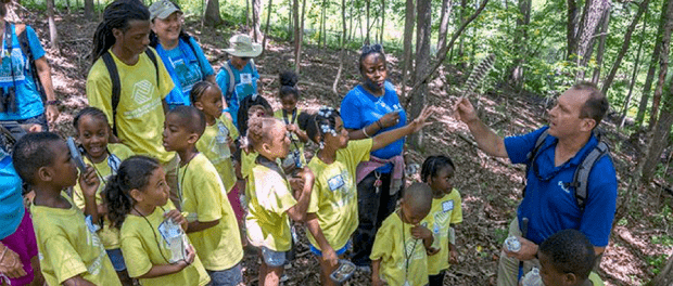 Header Image: Fletcher shows children a turkey feather while taking them out on a walk in the woods as part of NCWF’s Great Outdoor University. Photo courtesy of Scott Fletcher.
