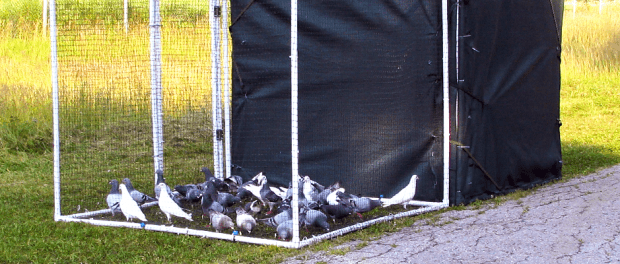 Header Image: Pigeons wait in a cage for a truck to drive by as part of an experiment on traffic exposure. Control pigeons in the covered cage have their view blocked, but are otherwise exposed to the same conditions. ©Travis DeVault