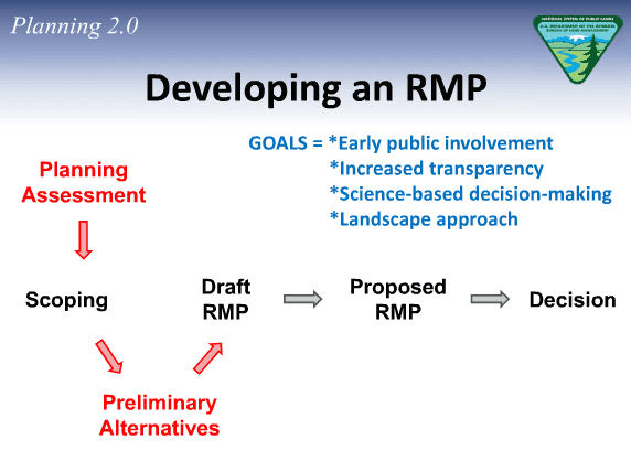 As Kornze suggested, the proposed changes in Planning 2.0 add a new first step, to precede scoping, called the “planning assessment.” This step explicitly calls for public input and coordination to gather information and assess baseline conditions.