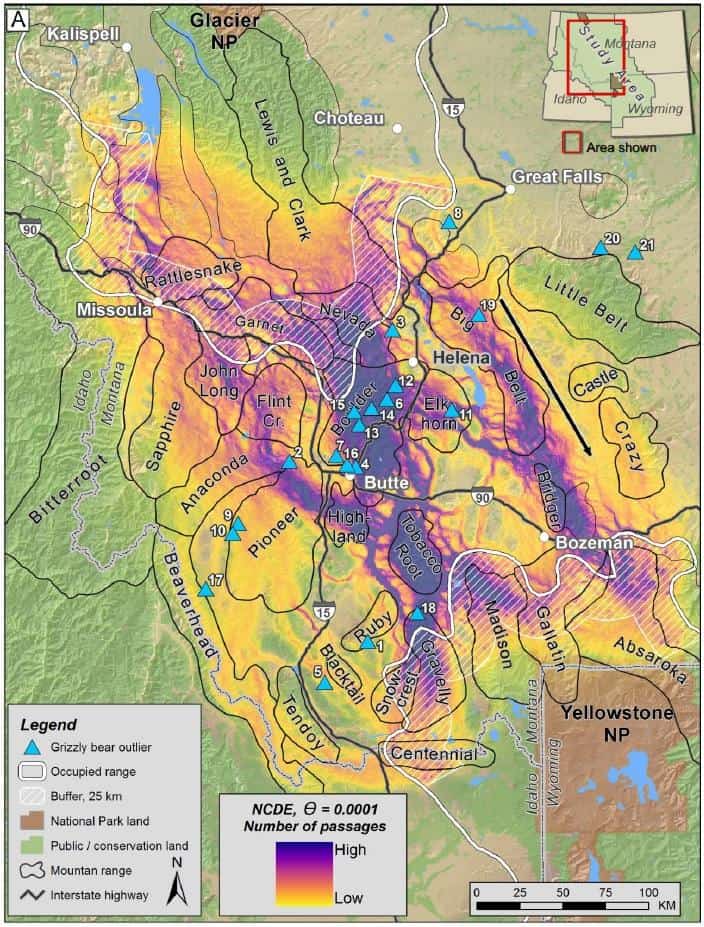 The team documented 21 instances of grizzlies outside their known occupied ranges, mostly from northern grizzlies dispersing toward Yellowstone. While they found no indication that a grizzly had ever crossed the entire distance from one ecosystem to another, the likelihood continues to grow, van Manen said. Male grizzlies typically disperse 30 to 40 kilometers — about one-third the distance between the two populations. But they have been known to travel as far as 170 kilometers, putting the two ecosystems within reach of a wide-ranging bear.