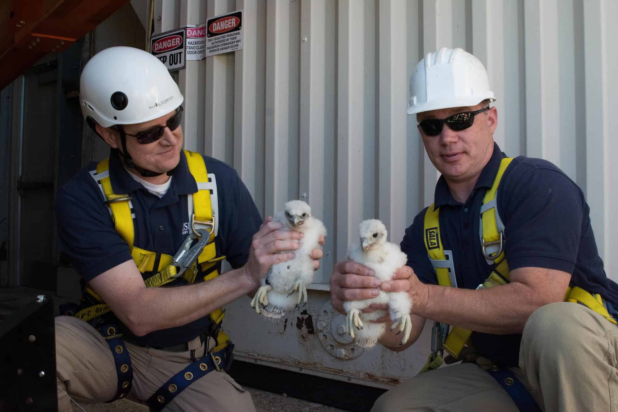Every spring in New England seems to bring stories of poorly located raptor nests resulting in conflicts with humans. At Westover Air Reserve Base, Wildlife Services-Massachusetts had its first peregrine falcon (Falco peregrinus) relocation this year. It wasn’t easy, but we hold great hopes for its success, and for the adults to find a better site than an airplane hangar to raise their young.