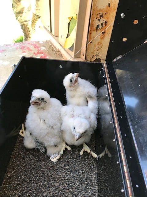 Biologists with the state agency suggested that peregrines, which are very sensitive to nest failure, may relocate if they experience nest failure for two or three consecutive years. They recommended hand-capture of the chicks at 14-16 days old for re-nesting in other nests with chicks of the same age.