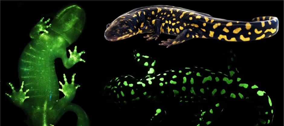 Could it be that many — maybe even all — amphibians glow and we never knew it? In a recent study in Scientific Reports, researchers found that a variety of amphibians lighting up with bioluminescence — species that were never before known to have that quality. Researchers tested eight families of salamanders, five families of frogs and one family of caecilians — limbless amphibians. All of them, even larvae, lit up in blue light, rather than the ultraviolet light researchers often use. Most were green, but some were yellow or orange.