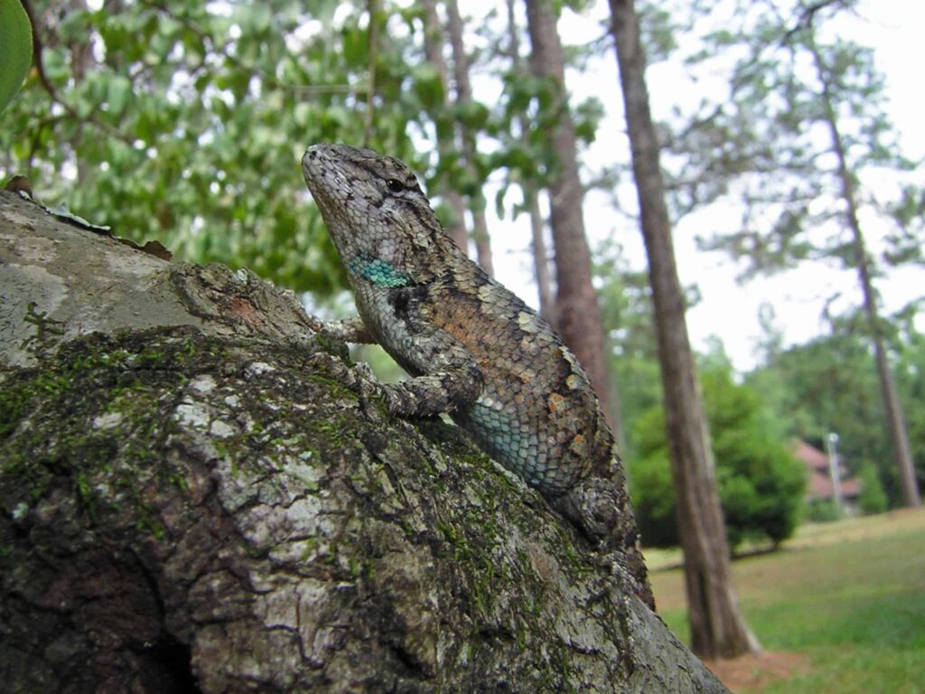 Typical female fence lizards (Sceloporus undulatus) sport drab brown colors, but a few of them display the shiny blue neck patches more commonly found on males.