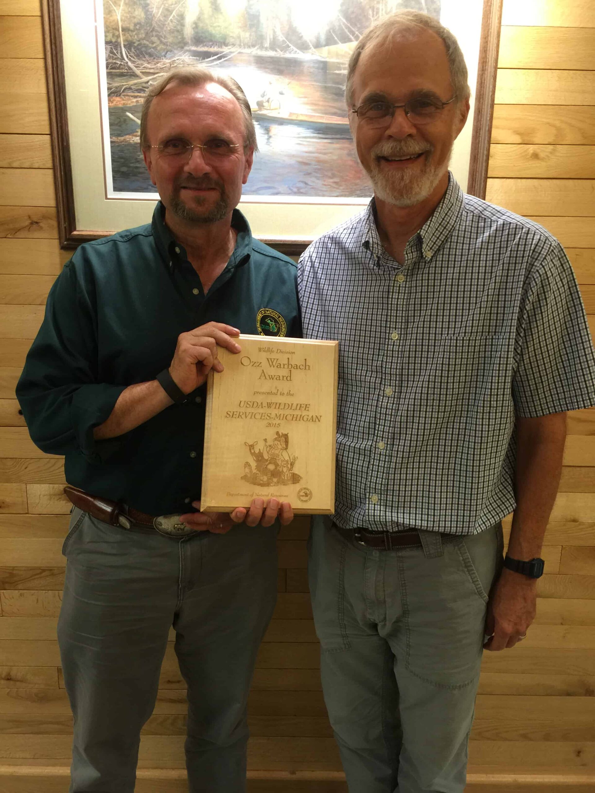 On August 18, the Michigan Department of Natural Resources held its annual all-hands meeting, complete with awards for the excellent work and service that the Wolverine State’s staff accomplishes. Also, the Department presented the Wildlife Services program in Michigan with the 2015 Ozz Warbach Award for outstanding partnership, which goes to an individual or organization outside the Wildlife Division that has been an exceptional partner with the State. It was named after Oscar “Ozz” Warbach, a research biologist and the Division’s Conservation Illustrator, who retired in 1977. Warbach demonstrated outstanding partnership with the public as he used illustration to make people aware of wildlife and environmental issues.