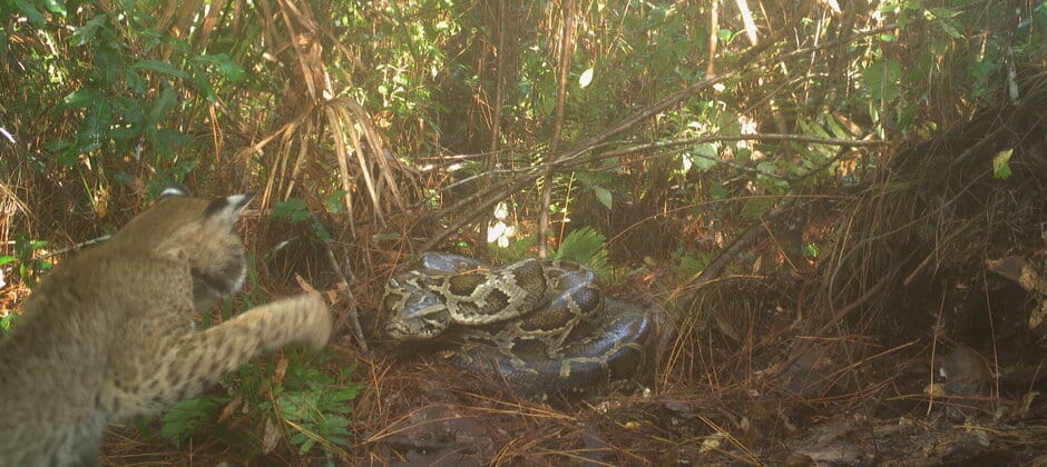 The bobcat eventually did encounter the python on camera, and the meeting appeared less than collegial. The bobcat even swiped at the large snake with its paw. Currylow said the photo they captured is the first on-camera evidence of antagonistic action in Florida between pythons and anything other than humans.