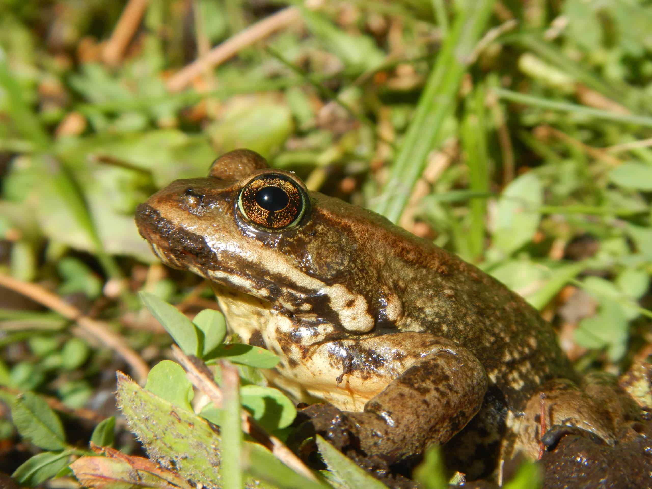 Cascades frogs (Rana cascadae) are found widely from Canada down to Northern California. The frogs, palm-sized and brownish gold in color with dark spots, typically live in wet montane meadows from moderate to high altitudes. They are active from roughly May to September or October, when they burrow into the bottom of lakes or underneath the snow to hibernate.