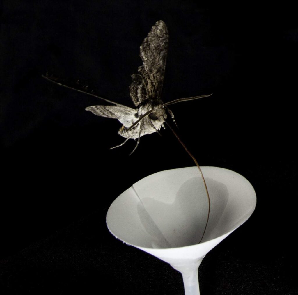 A tobacco hawkmoth visits an artificial paper flower emitting a pale evening primrose scent. Credit: Charles Hedgcock/University of Washington