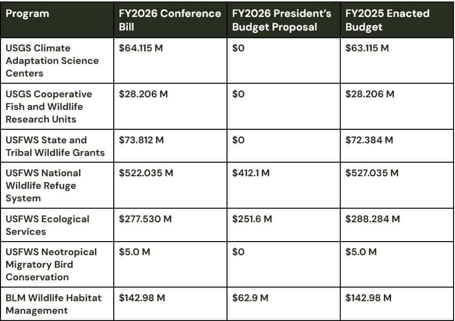 The spending levels proposed in the conferenced bill are, in many cases, markedly different from the administration’s budget proposal released earlier this year. It rejects the elimination of program funding requested in the president’s proposal for many key conservation programs. Still, Congress is proposing funding cuts across the majority of these programs compared to FY2025.