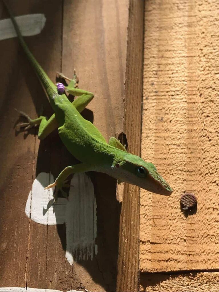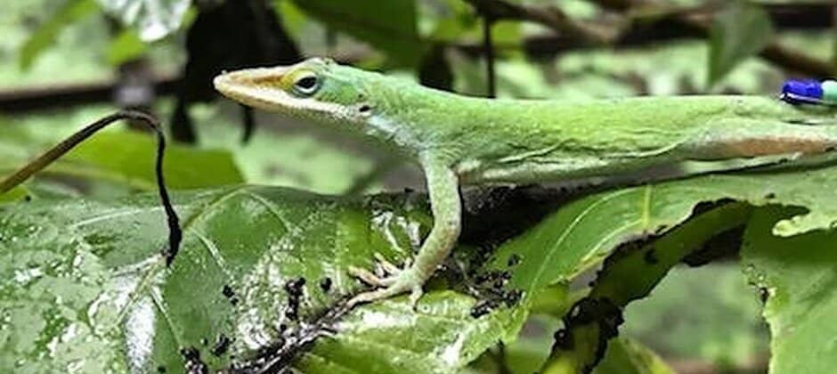 The researchers fixed color-coded plastic beads using a small wire on the base of the lizards’ tails to tell them apart. Then, they introduced a group of native green anoles to the open-air enclosures that were about the size of a small barn—16 feet high with trees and potted plants. They observed their behaviors for 10 days as the anoles got used to their new environment.