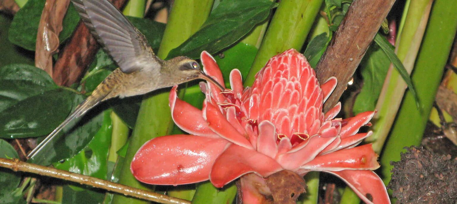 Biologists know that hummingbirds can adapt their vocalizations by listening to others. Can they adapt their visual displays by watching others, too? In a study in Proceedings of the Royal Society B, researchers looked at the visual displays that male long-billed hermit hummingbirds (Phaethornis longirostris) use to attract mates and defend their territory. They found each community of birds has its own variations on both the songs and the displays, indicating social learning.