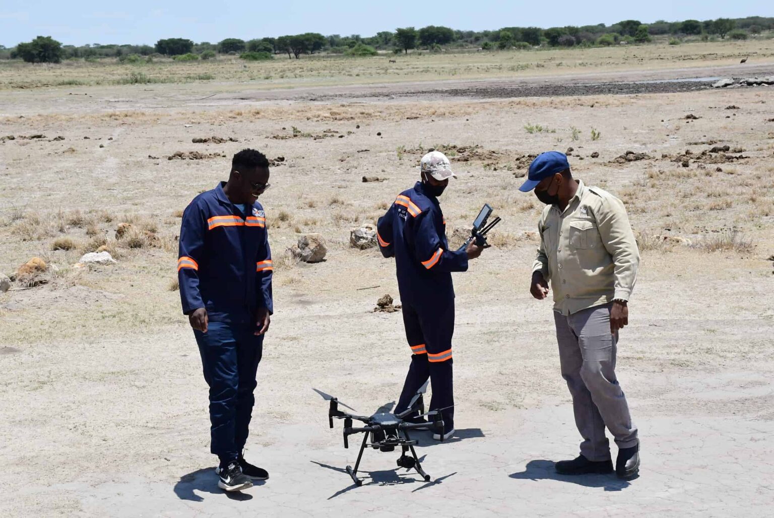 Image Caption: Researchers preparing to collect research data in Botswana. From left to right: Wazha Mmereki, lead researcher human behavior classification, Tinao Petso, lead researcher wildlife herd behavior classification, and Oarabile Monyamane, conservation biologist