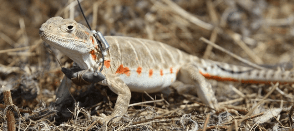 Using poles with strings tied in slipknots at the end, the researchers lassoed 20 blunt-nosed leopard lizards at each of two different sites at Carrizo Plain in 2019. After collecting them, they fitted the 40 lizards with radio-telemetry tracking collars equipped to track their body temperatures. These devices pinged information to a receiver that stored the temperature data from all lizards roughly within a 300-meter radius. They tracked the lizards for 5 to 6 days a week for 2.5 months during the summer. They also mapped the surrounding habitat features.