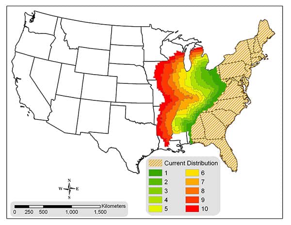 To better quantify the benefits of the NRMP, researchers at Wildlife Services’ National Wildlife Research Center (NWRC) and partners modeled the spread of raccoon rabies over 20 years in the absence of current ORV activities in the East. The forecast included 10 raccoon rabies spread-expansion regions each representing a 2-year timeframe. The combined 10 regions show the extent raccoon rabies is projected to spread after a 20-year period without ORV intervention. The forecast models incorporated three different rates of spread: low (15 km/year), medium (30 km/year), and high (60 km/year) based on historical rates of raccoon rabies spread in the eastern United States. Over the 20-year horizon, spread would extend as far west as the Texas border and western Iowa. However, over a longer time period, the spread would likely continue to the Rocky Mountains, where harsh winters and unsuitable habitat might prevent any further westward movement. Such an expansion would cause approximately $1.1 billion in additional damages due to an increased need in human post-exposure treatments, livestock and pet losses, and impacts to wildlife resources.