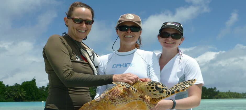 Header Image: A hawksbill sea turtle from Palmyra Atoll sampled for a recent study, held by Kate McFadden, Jennifer Lynch, and Frannie Nilsen, from left to right. Credit: Cheryl King