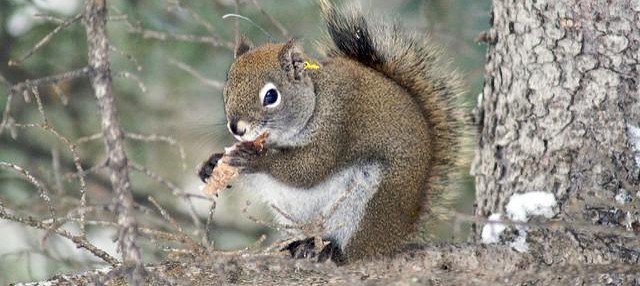 To survive amid spruce trees, where cone production comes and goes from year to year, North American red squirrels (Tamiasciurus hudsonicus) put away cones during boom years to have something to eat during bust years. They defend these middens from their neighbors, storing cones away in cool, moist ground to keep the seeds fresh.