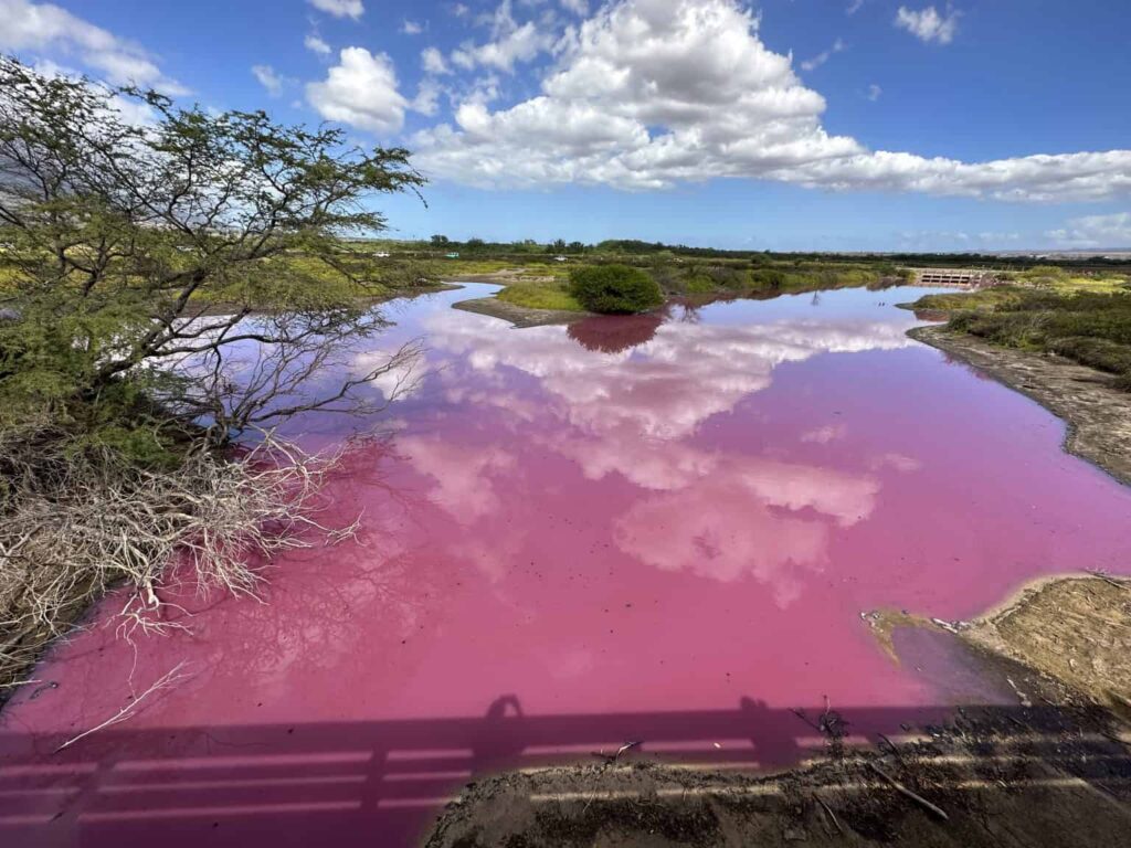 What turned a Hawaiian wildlife refuge pond bright pink?