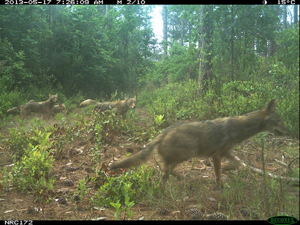 Most coyote images collected by the team show solitary animals, but occasional shots show the animals hunting in packs. “When we did our statistical analysis, the number of coyotes seen at a site was the best explanatory variable,” Kays said. Aside from Raleigh’s urban areas, camera traps took photos in 32 protected sites like state or national parks and noticed immediately that there were rarely images of cats in areas that appeared to have lots of coyotes.