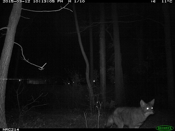 Recent research by member of The Wildlife Society Stanley Gehrt showed that coyotes have adapted to living in heavily urbanized areas of Chicago. But Kays said coyotes are relatively newer in cities like Raleigh, where they still appear to stick to wilderness areas. Nonetheless, coyotes sometimes approach buildings — this one was taken from a camera set up by middle school volunteers. “In five years I’m sure they’ll be more urban than they are today,” Kays said.