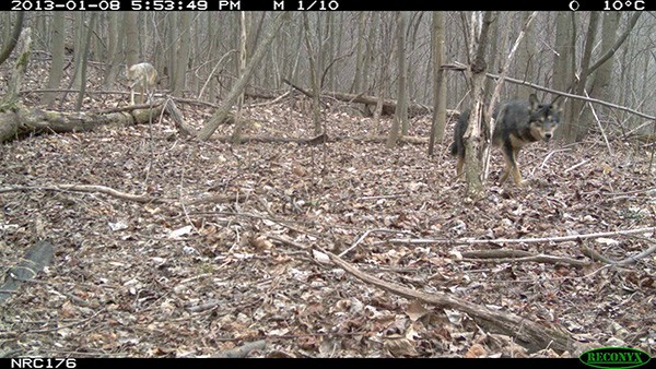 Many coyotes in the east, such as the one pictured here on the left, are hybridized with domestic dogs. “In some ways coyotes are kind of an invasive species in the east,” Kays said. But many wildlife ecologists see them as the closest thing the region may get to the former wolf population.