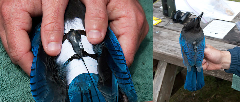 To find out how camps altered Steller’s jay behavior, Goldenberg and his colleagues attached radio transmitters to 20 Steller’s jays at campgrounds and 10 jays living deeper in the forest. The transmitters, which resembled tiny backpacks with backward-pointing antennae, enabled the researchers to track the birds and monitor their movements. Because of the small sample size, the researchers weren’t able to directly compare how much jays’ ranges overlapped at campgrounds versus deeper in the forest. However, the researchers observed more jays at campgrounds, and the birds’ home range sizes were similar everywhere, suggesting that jays are more willing to share space in areas where human food is plentiful.