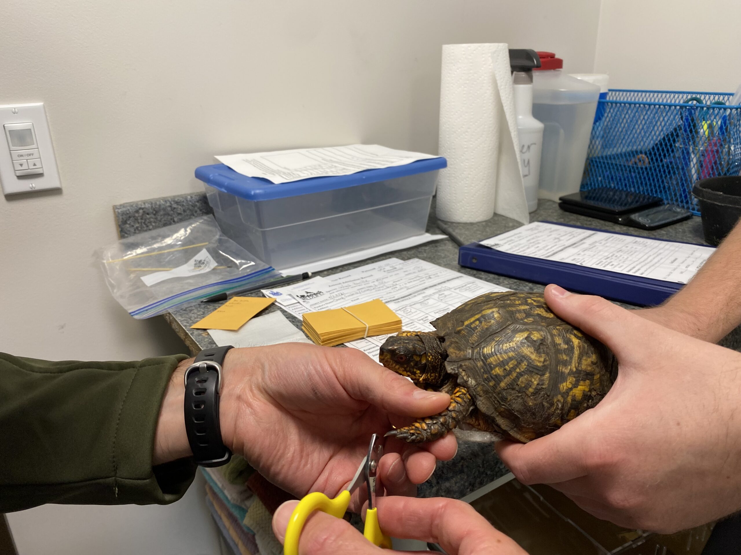 Since toenails are slow-growing, the chemical profile they store lasts for a while. Chatfield isn’t sure exactly how long it takes a wild animal taken into captivity to lose its wild chemical signature. But preliminary tests of nail clippings taken every two months for a turtle taken into a rehab center show it takes at least six months before the chemical signature starts to change.