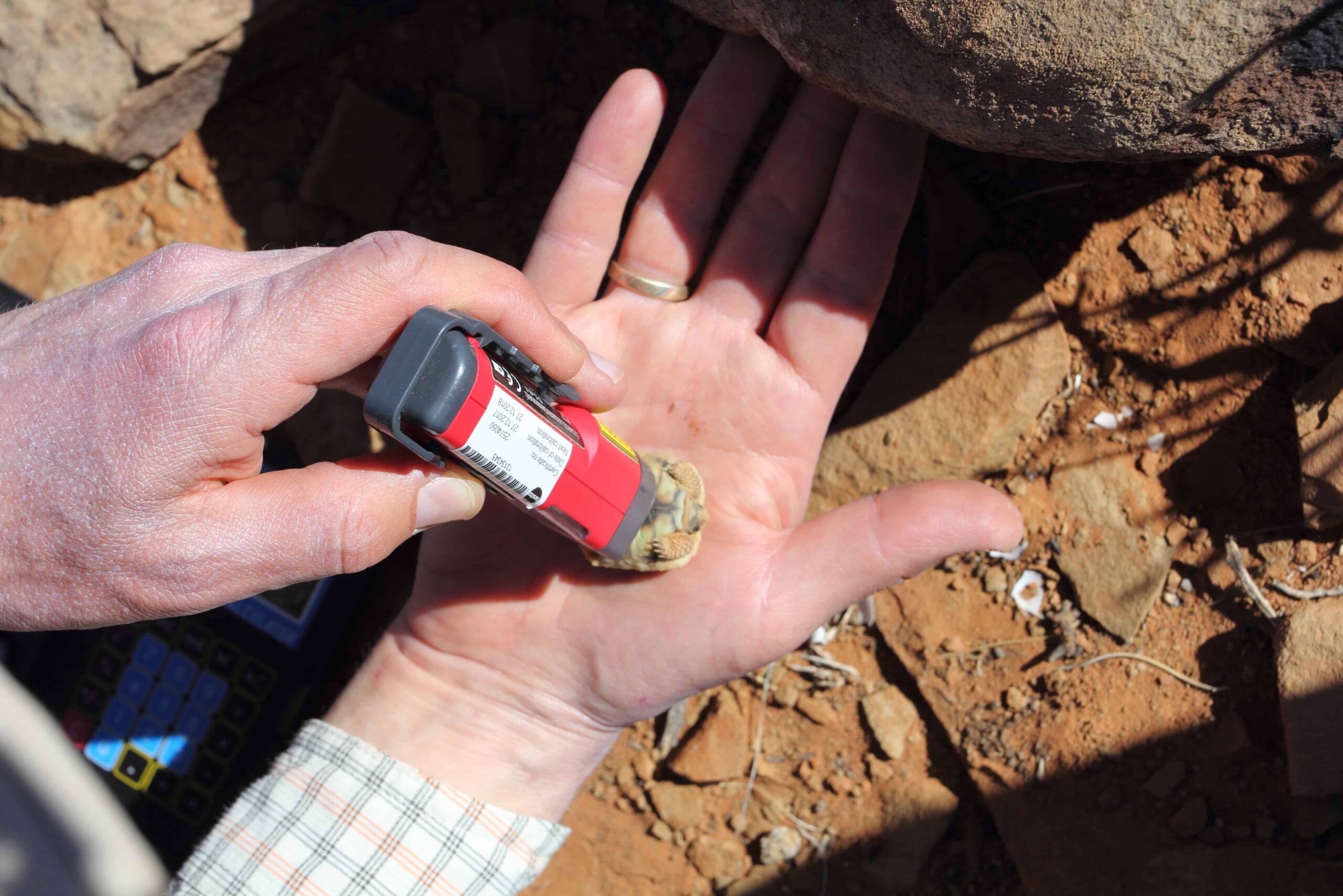 A tortoise fitted with a radio transmitter tracking device. Credit: Victor Loehr