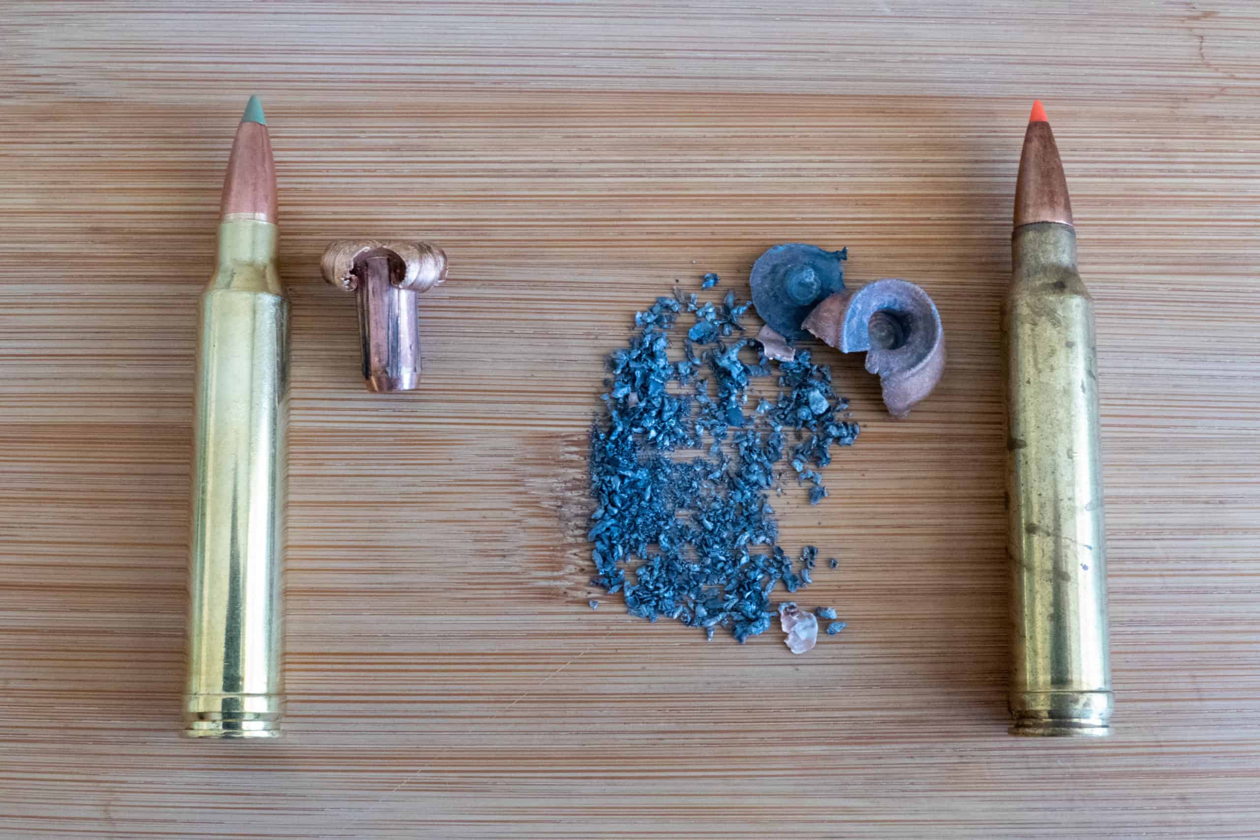 A photo showing how a lead bullet, on the right, fragments compared to a copper bullet (left). Scavengers, like eagles, can easily ingest these fragments. Credit: Mike McTee