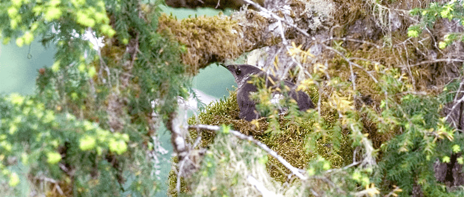 From 2004 to 2008, Martin Raphael, a co-author who is also a research wildlife biologist at the Pacific Northwest Research Station, and his colleagues followed over 150 radio-tagged murrelets to track their breeding and use of space. Whenever they could push through the remote, dense forest, the scientists also hiked to identified nests and set up cameras to monitor the birds. Analyzing the data collected, Lorenz found that the murrelets traveled much wider foraging ranges in the water and longer distances between the sea and nests than did much more abundant Alaskan populations of the bird.