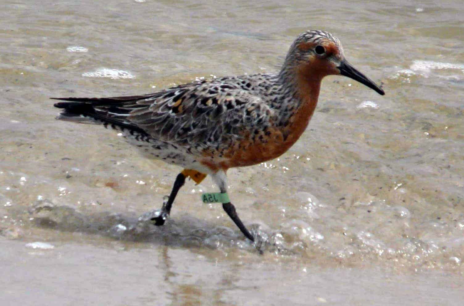 The data from the device revealed that red knots traveling north from the Caribbean and northern South America spent a lot longer in Delaware Bay fattening up on Atlantic horseshoe crab (Limulus polyphemus) eggs—often more than two weeks. The Tierra del Fuego birds, on the other hand, only spent about a week there before moving on.