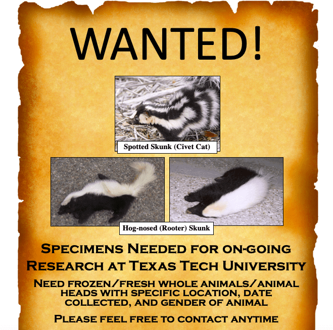 Ferguson and his colleagues turned to museum specimens. But they also collected modern specimens by distributing posters across Texas for people who have trapped them or discovered them as roadkill to bring them to the researchers. They also wrote to a lot of colleagues and friends, who sent in samples of muscle or liver for the team to use to collect DNA. The team ended up with more than 200 spotted skunk specimens collected from throughout their range, which extends north to south from British Columbia to Costa Rica.
