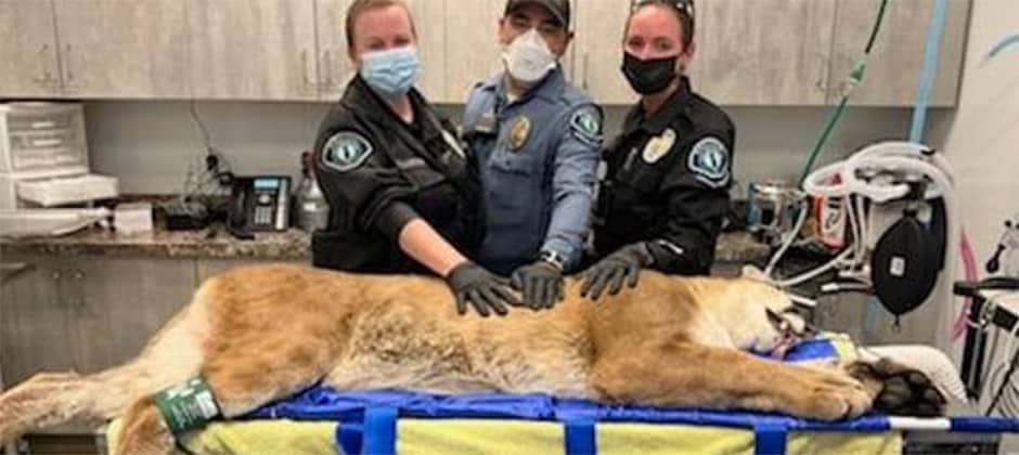 The sedated mountain lion was transported to the clinic to be examined and collared before being released into the wild.