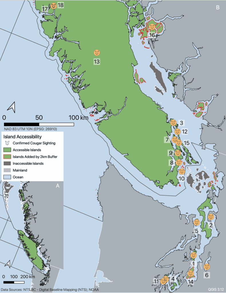 And they have, the team found. The researchers gathered cougar records on other islands in the Salish Sea for a study published recently in Northwestern Naturalist. They confirmed cougar presence at some point on 18 islands, including four that would have required swims of about 2 kilometers. This opens up the possibility that cougars could reach roughly 4,500 islands in the Salish Sea, Elbroch said, and it explains why Vancouver Island in British Columbia has a thriving cougar population.