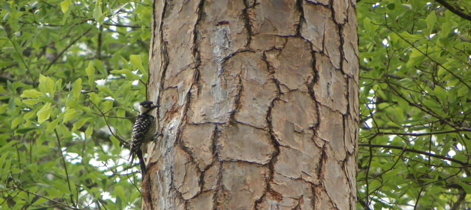 Red-cockaded woodpeckers typically nest in pines that have been infected by red heart rot, a type of fungus that gets into the trees and softens up parts of their heartwood, the dense inner part of the tree trunk. Infected trees are easier for the woodpeckers to drill into, but not all trees are suitable for this. Also, trees with close canopies and more mid-story branches aren’t great for the birds, since they can allow access to nest predators like rat snakes. This is part of the reason regular fires are important in providing optimal habitats for woodpecker nests.