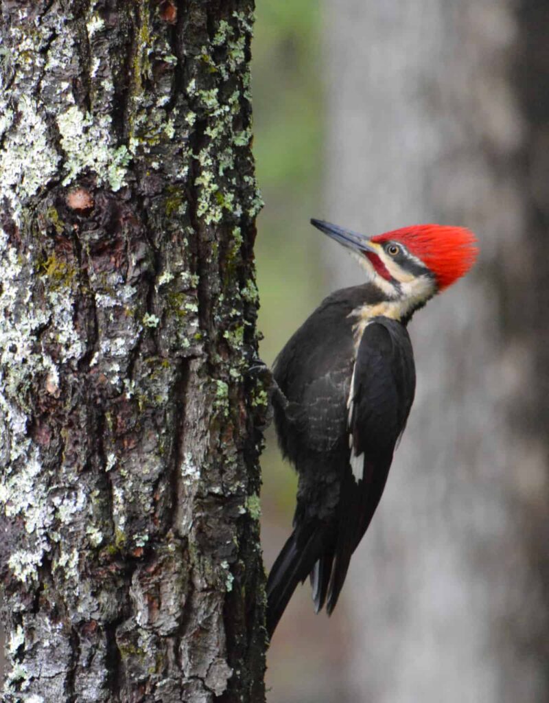 Pileated woodpeckers (Dryocopus pileatus), which range from British Columbia all the way south to Florida, prefer mature woodlands with dead trees. They peck out tree cavities to nest in, leaving behind habitat for other species that use them as well.