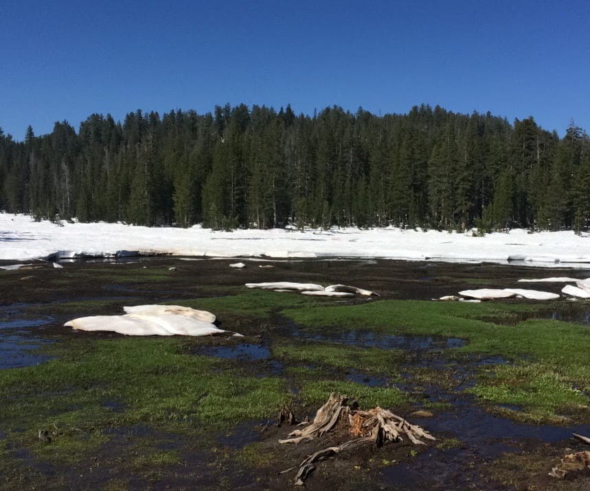 The biggest surprise from the site visit was how loud the meadow was. Normally, when we visit remote sites in the Sierra Nevada away from human activity, it is remarkably quiet except for singing birds. But not in a Yosemite toad breeding meadow. Male Yosemite toads make a trilling call to attract females. Pacific tree frogs were also breeding in the meadow; they also call to attract mates. There were so many well-camouflaged toads and frogs — some the size of a dime — that we had to watch our every step. Hundreds of amphibians trilling and hopping around made it seem like the meadow itself was alive.