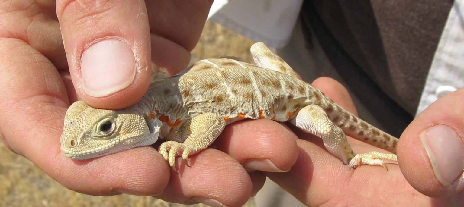 I learned how elusive these show-stopping lizards can be. The adults were relatively large (about the size of a ruler) and had distinctive color that stood out from their surroundings. The underside of their heads and bodies was a vivid white and the females still had their breeding colors of bright red-orange spots on the sides of their heads and bodies. Despite being so distinctive, these leopard lizards made themselves scarce, retreating into small mammal burrows in the blink of an eye. On the trip into one of the sites we did not see a single lizard. On the same trip out less than a few hours later we counted more than a dozen out in the open during the hottest part of the day.
