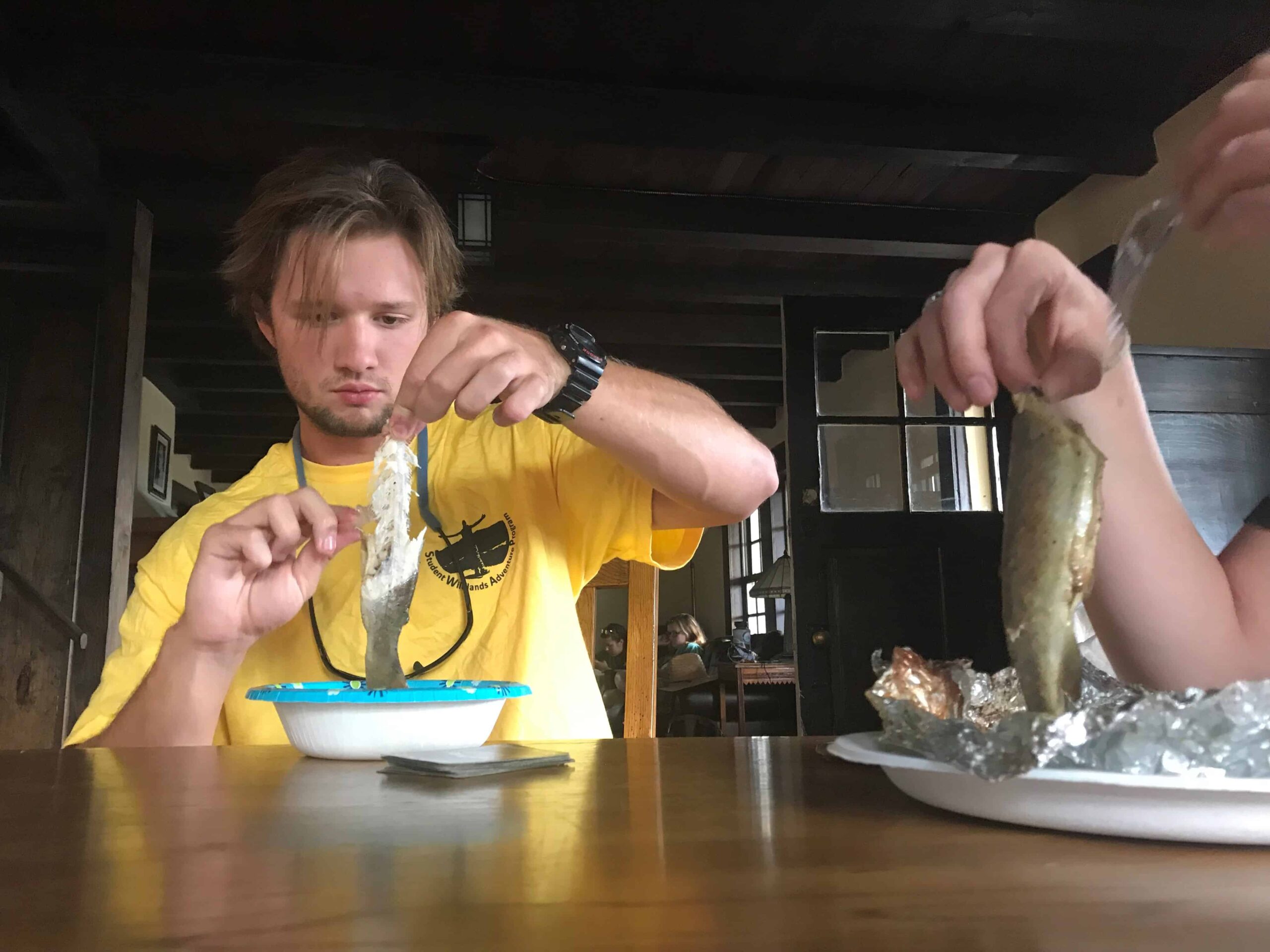 A SWAP student dining on a meal of wild-caught trout inside the Aldo Leopold cabin. ©Daryl Ratajczak