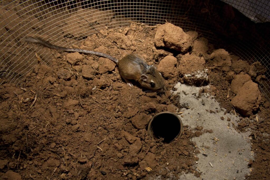 Kangaroo rats live in underground burrows, a little like single-family homes, near the burrows of other family groups. Before gathering up founders from the three populations, the researchers observed where individuals were living using night vision goggles. They mapped out neighborhoods, recording which rats lived where. As they collected the rats, they marked them with color-coded ear tags, placing individuals in acclimation chambers that mimicked the kind of burrows they dug.