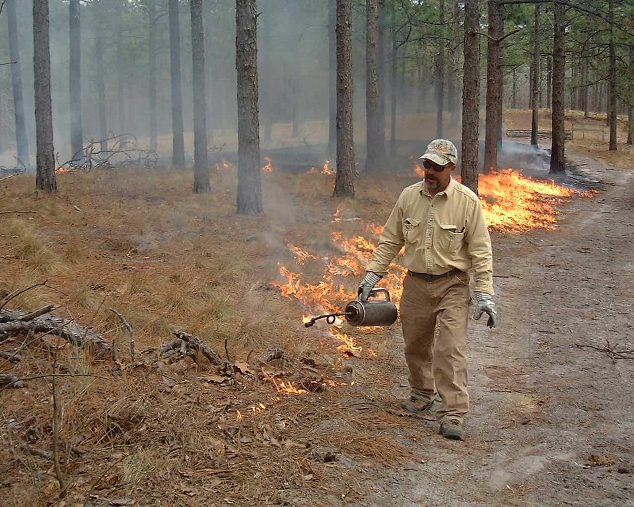 Today, these forests represent significant components of the region’s ecological diversity and offer new economic opportunities for many private landowners as they also provide essential habitat for many rare animals and plants. Restoring periodic fire as a disturbance is fundamental to the ecological restoration and maintenance of longleaf pine ecosystems. The role of fire in the longleaf pine ecosystem was and still is a key component in regenerating and shaping this forest. Most fires occurred during the growing season and were ignited by lightning that accompanied frequent thunderstorms that occurred across the Southeast. Once ignited, a fire could burn across the landscape for days, weeks, and even months due to the lack of habitat fragmentation that we see today. The longleaf pine ecosystem is known as a fire climax community. The Longleaf Alliance defines a fire climax community as “a plant and animal community that is limited by and adapted to an early successional stage by frequent fire disturbances.” Cambridge professor Andrew Balmford suggests that “rather than responding to fire, longleaf has evolved to promote it: botanical arson as a means of incinerating the would-be competition.”