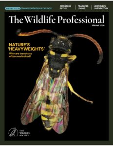 The cover feature of the Spring issue of The Wildlife Professional brings us into the world of insects and zooms into some of the major roles they play and the conservation challenges they face. Staff writer Olivia Milloway introduces us to mayflies, a sentinel species for water quality that is declining. She also delves into the American burying beetle, a species that benefits the plants around them, and how a lack of data makes them harder to conserve.