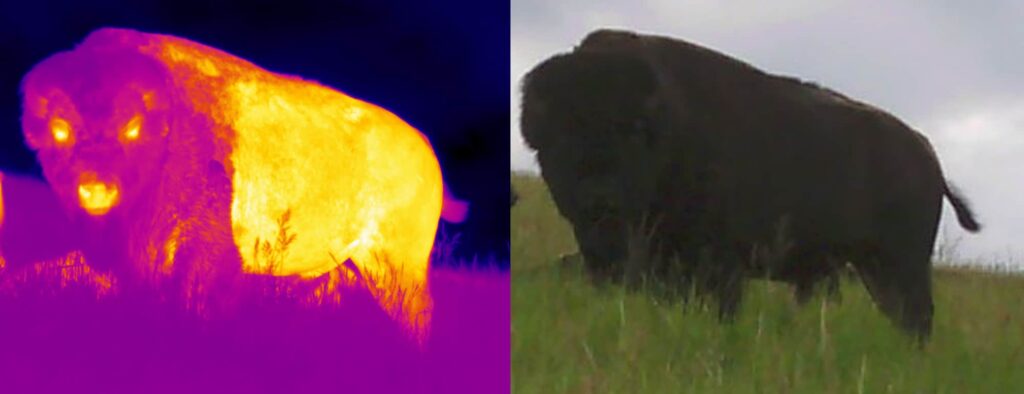 In the study published in Ecosphere, Martin and his colleagues used thermal imagery to determine the amount of heat bison were taking in and where they were taking in heat. The thermal imagery used white and yellow for hot areas and blues and purples for cooler areas. For bison, most of their heat is focused around the abdomen.