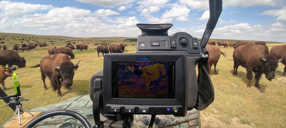 Then, they accounted for body size of adolescent bison. Martin took a trip 9,000 miles from Texas to Saskatchewan and back in the summer of 2017, and he did it again in the winter of 2018, checking in on bison at 19 locations along the way. In each spot, he estimated the bisons’ height using a digital laser rangefinder and took pictures with a thermal imaging camera. Using the data, they were able to see what the biggest drivers were of heat transfer in bison, which varies season to season.