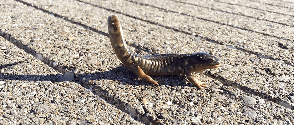 The Natural Resources Management Team has observed the California Tiger Salamander traveling more than a half mile from a breeding pond to a burrow in upland habitat on the base, but the species has been documented to travel over a mile when moving from a breeding pond to appropriate upland habitat at other locations. In 2017, a year with high rainfall, the salamander attempted to cross a runway where military aircraft takeoff and land daily. The team has put measures in place to monitor the species and to avoid impacts that could threaten its survival and prevent aircraft from flying safely. Personnel use dipnets to check breeding ponds for larvae. This identifies which ponds are used for breeding each season, larvae development and pond water levels. Recently, the team installed silt fencing to help guide the California Tiger Salamander to safe upland habitat, while avoiding the runway.