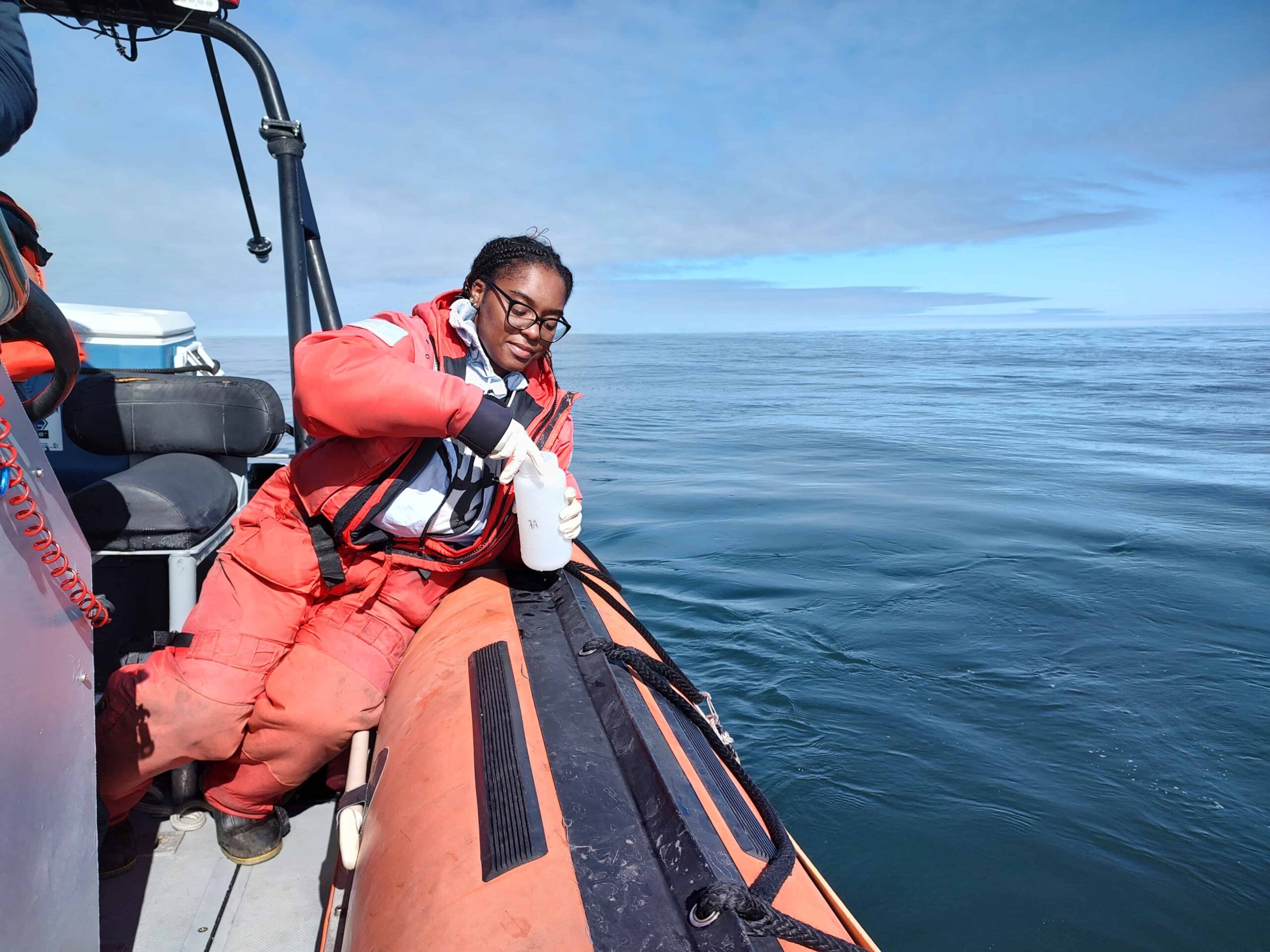VIEW Fellow Amari Carter samples for gray whale eDNA. Credit: Clarissa Teixeira