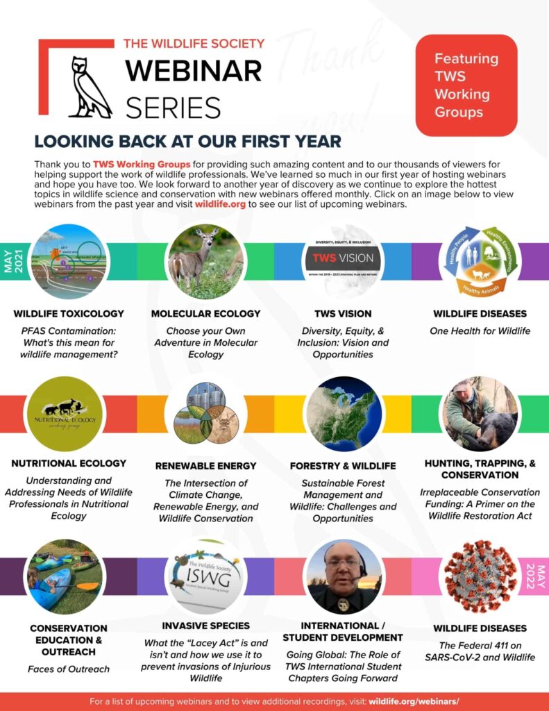 The Wildlife Society is continuing the webinar series this year and is looking for submissions for upcoming topics, especially from working groups that haven’t yet participated. They also hope to reach more wildlife biologists that may eventually want to become TWS members.