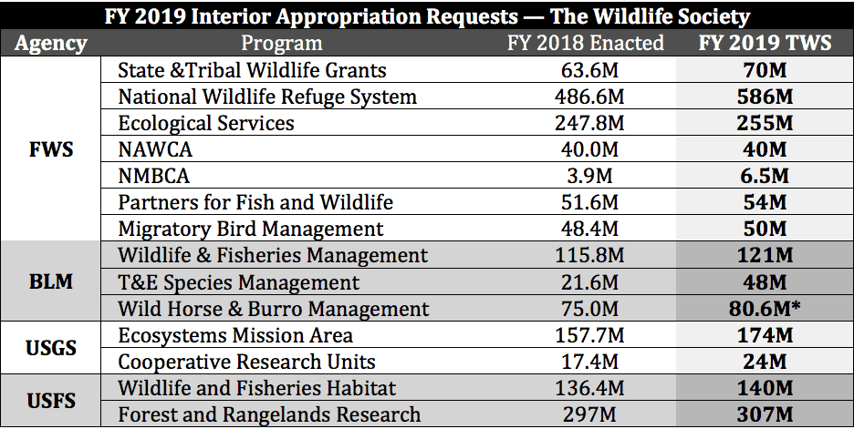 TWS also asked Congress to reinstate funding for the BLM’s Wild Horse and Burro Management program at the FY2017 level of $80.6 million, and to remove an associated policy rider. The FY2018 budget reduced the program’s funding from $80.6 million to $75 million.