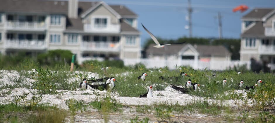 In Cape May County, the U.S. Army Corps of Engineers has taken material they dredge from the inshore canals to clear shipping passages and formed raised areas that birds like black skimmers (Rynchops niger) can use as alternative nesting habitats. They built two of these raised platforms from the materials: one on Ring Island in 2014, and Great Flats in 2018. These areas also help build resilience to storm surge and mitigate some of the losses of salt marsh to sea level rise.