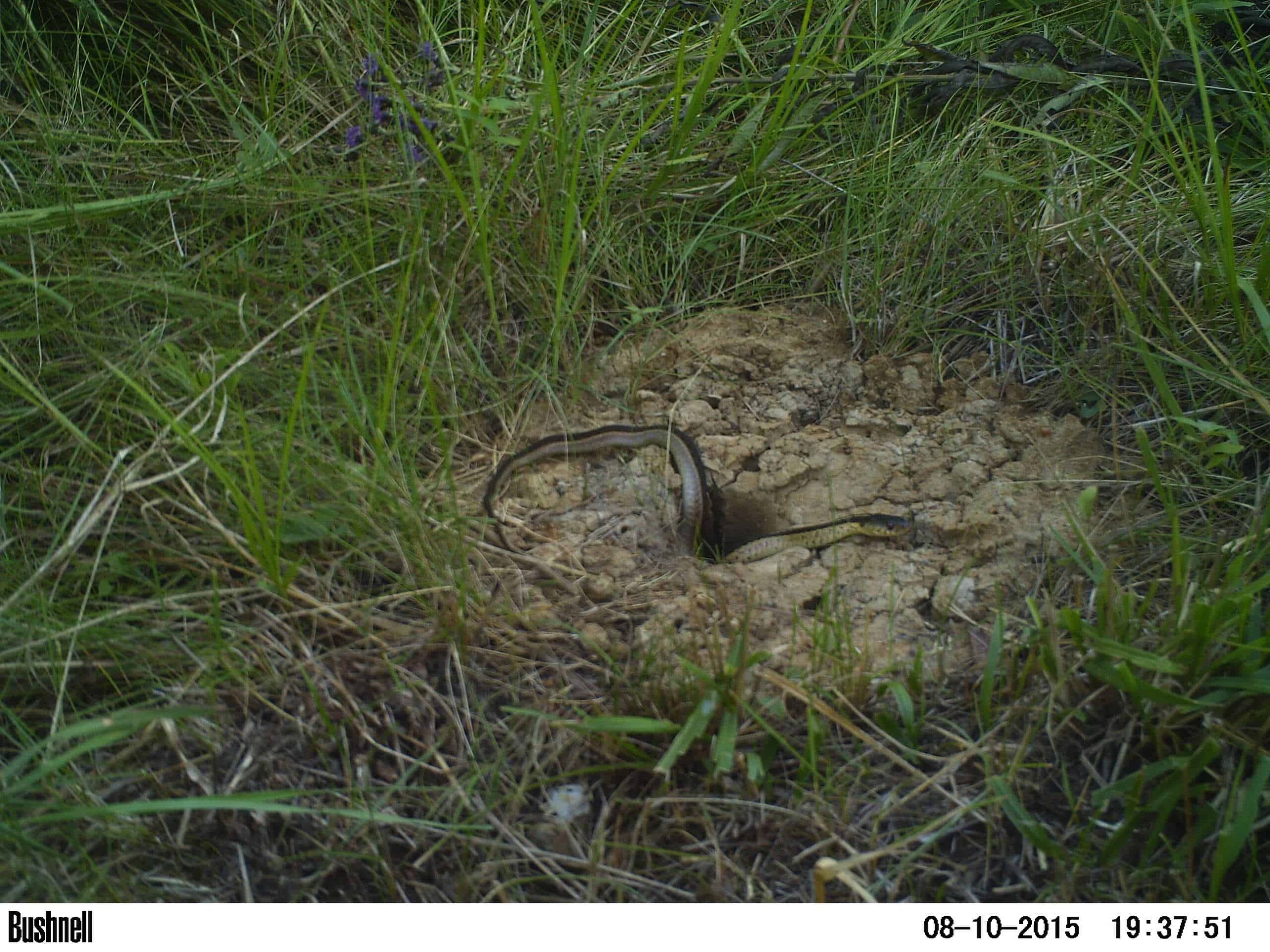 As part of their research, after releasing juvenile frogs into artificial burrows as well as reptariums — cages placed in ponds used to keep the frogs housed and protected — researchers monitored the frogs’ behavior through wildlife camera traps placed next to the burrows, and found that they have a propensity to move, which decreased with time after their metamorphosis. In the photographs, the researchers also observed some snake predation while the frogs were at the burrows. They also put radio transmitters on a small subset of juveniles to determine where they were moving to. In one instance, a frog moved from an artificial burrow to a crayfish burrow, only to be eaten by a common gartersnake.
