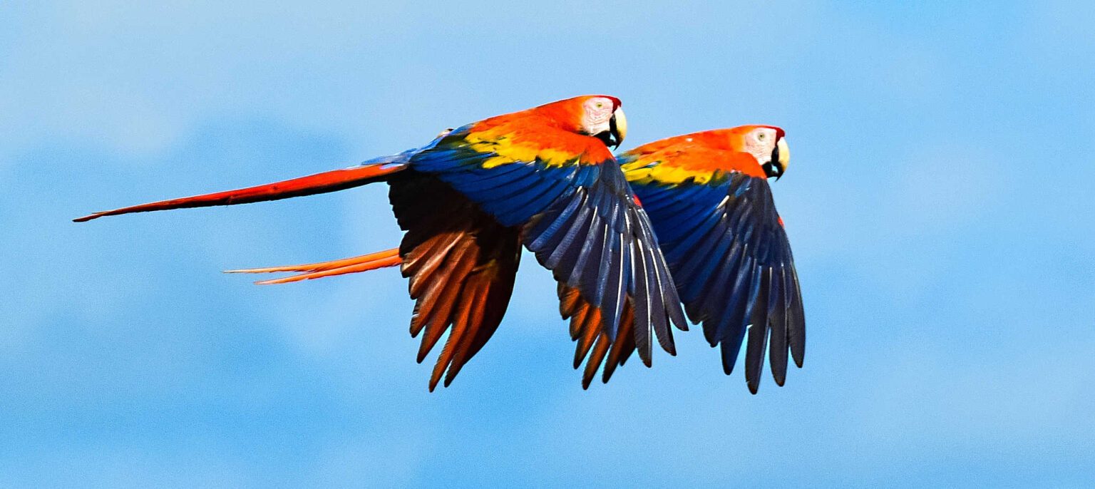 Scarlet macaws are large neotropical parrots native to Mexico, Central America and South America, with the greatest concentration of their population in the Amazon. Destruction of the birds’ habitat and collection for the pet trade have reduced the scarlet macaw’s range in Mexico and Central America. It is no longer found in most of its former range in those areas.